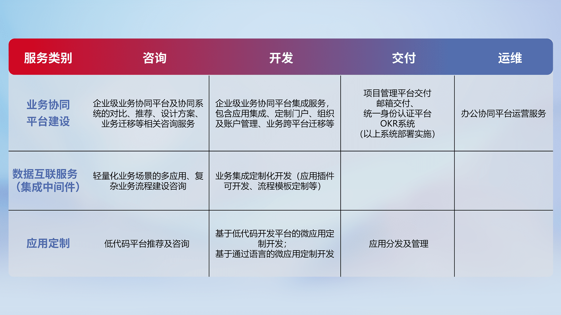 针对钉钉、、企微、、IDaas等平台级产品提供产品的规划、、、方案、、交付、、、、定制化开发等服务,,实现如统一协同办公、、智能客户服务、、、、混合会议管理、、智能数据查询、、、等业务场景,,实现数字化转型。。。。